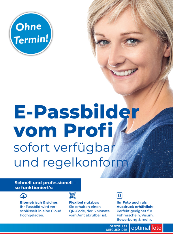 Das biometrische E-Passbild können Sie nach nur wenigen Minuten ausgedruckt mit QR-Code mitnehmen. Für die Aufnahme zum Passbild benötigen Sie keinen Termin. Wir bieten Ihnen das E-Passbild für 19,99 Euro an.